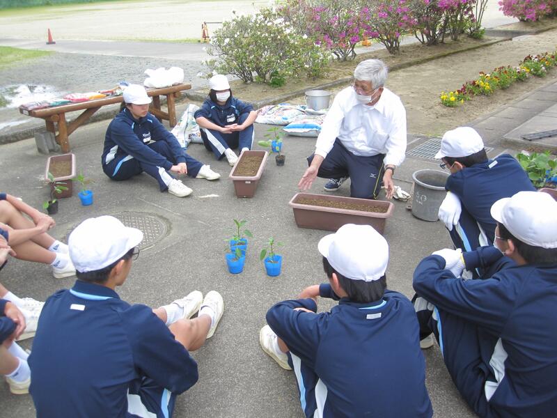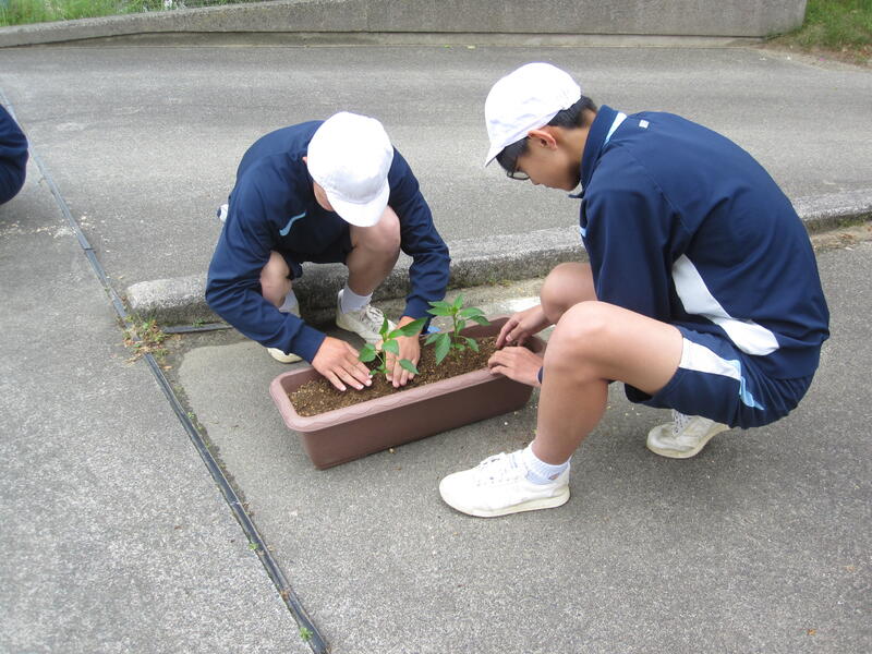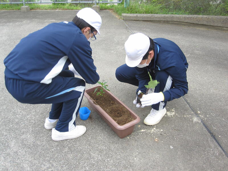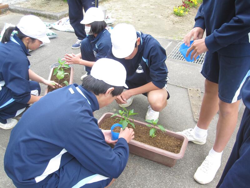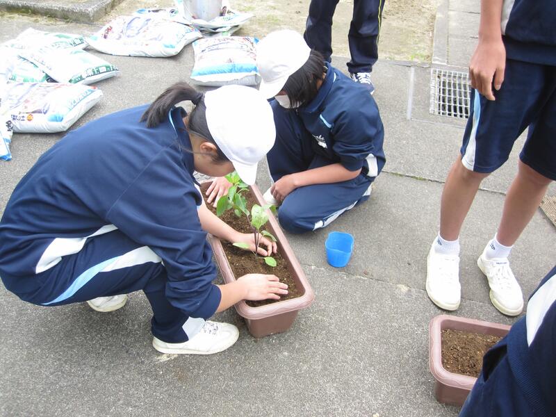 今日の3年生の技術では、栽培の実習としてナスとピーマンの苗を植えました。