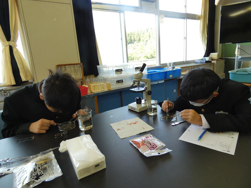 ・動物の分類の仕方について、考えています。まずは、煮干しやえびの解剖をしてからだのつくりの特徴を調べました。