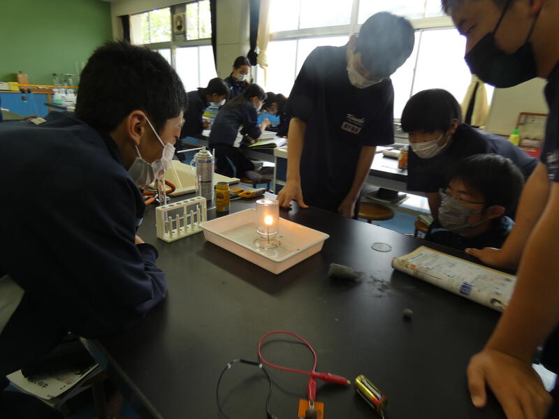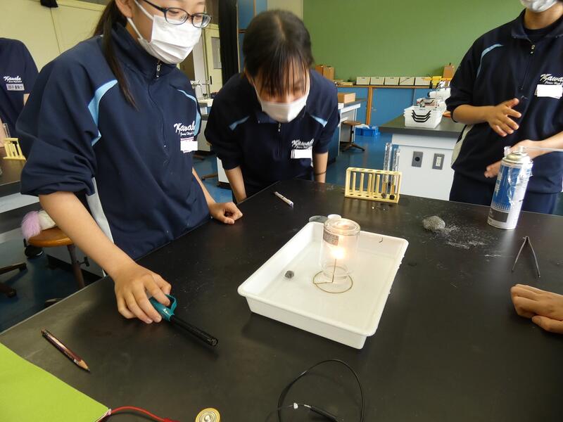 ・酸素を入れた集気びんの中でスチールウールを燃やします。燃やすと集気びんの中に水が上がっていきます。