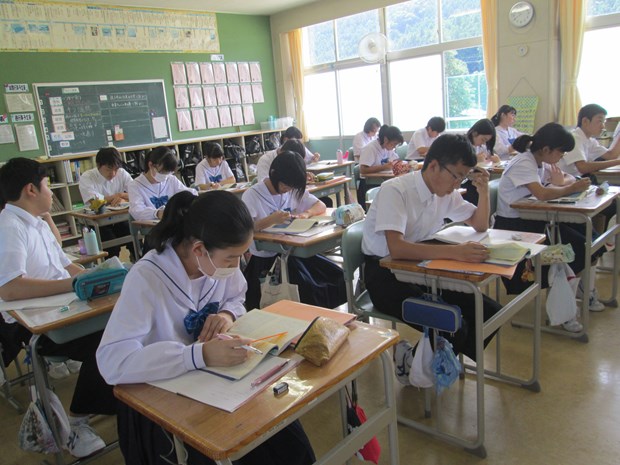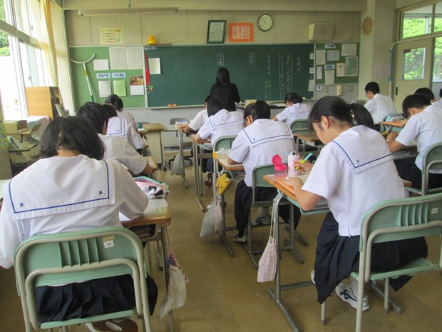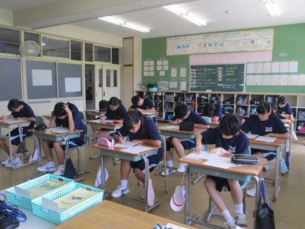 授業の様子 2017年9月1日 16時08分 2年生 技術 回路について 急に大きな声になったりとメリハリのある授業です。3年生 国語 高瀬舟 落ち着いた雰囲気で内容の理解に努めています。1年生 数学 1学期の復習 静かに問題を解いています。