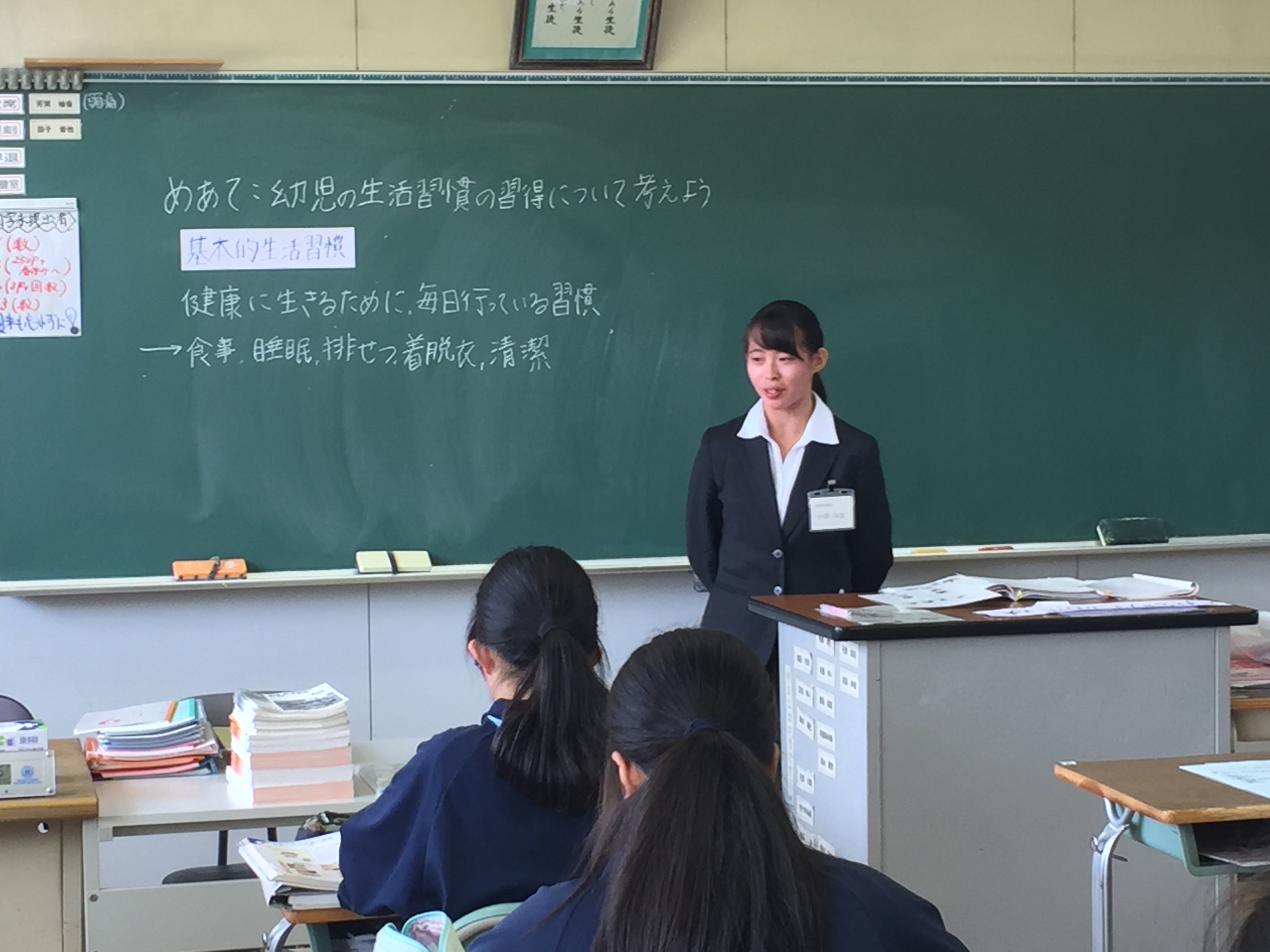 2018年5月21日 14時53分3週目に入った教育実習。今日は3年生の家庭科「保育」で教育実習生研究授業が実施されました。指導教官と何度も指導案の検討を繰り返し、発問や板書計画を綿密に準備し、生徒活動を効果的に取り入れた授業でした。保育に関するおもちゃや衣服を準備するなど実習生の意欲が感じられました