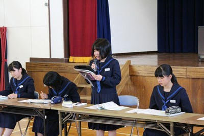 3年生女子生徒が議長を務め、生徒会本部の会計報告・事業計画、各委員会の事業計画の説明がありました。その後それぞれの議題に関する質問や要望などが数多く出され、各担当が丁寧に答えていました。