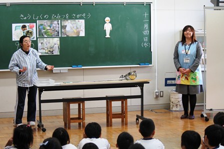 小名浜給食調理場の先生方を講師に招き、1年生に「食に関する指導」を行いました。