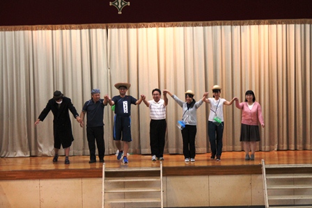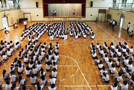 体育館では、不審者に出会ったらどうしたらよいかを先生たちの寸劇(「劇団 菊の子」)を見て学びました。