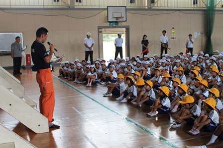 子どもたちは、「お・か・し・も」の合言葉のもと、真剣な態度で避難訓練を行いました。
