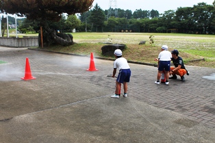 低・高学年は「煙の部屋での避難体験」、中学年は「消火器による消火活動体験」を行いました。