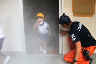 最後の写真は、煙体験の部屋の中を写したものです。写真で見るよりもさらに視界が悪い中での避難体験でした。