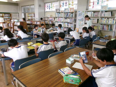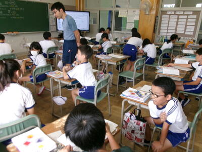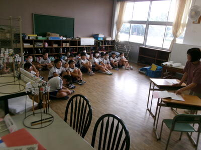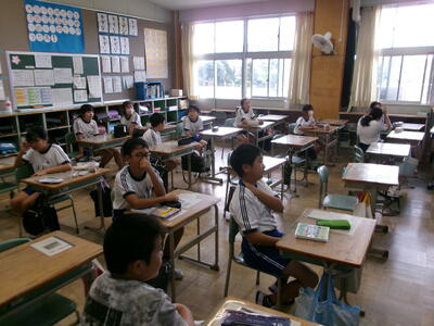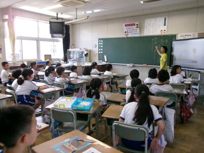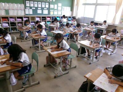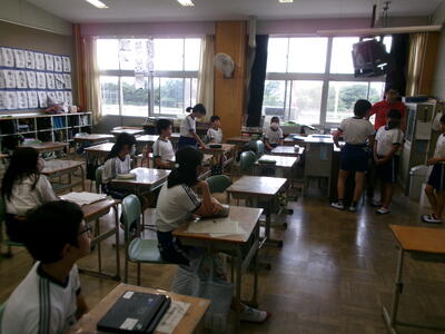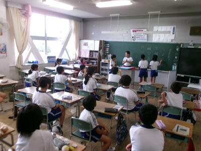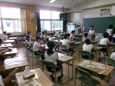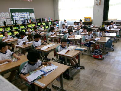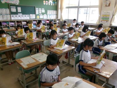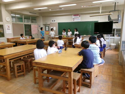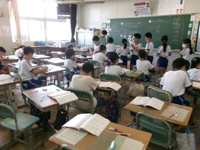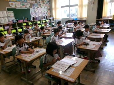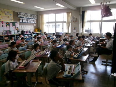 1年2組では、テレビの昔話のエンディング曲を楽しそうに歌っていました。