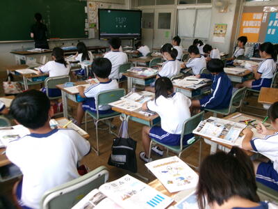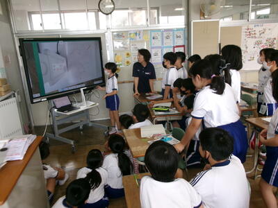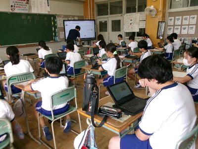 5年2組はタブレットを使って意見交流学習の練習です。