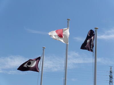 国旗、市旗、校旗が青空をバックにきれいにはためいています。でも、暑そうです・・・