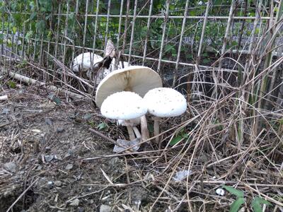 昨日はカサが開いておらずマイクのように見えましたが、一夜でカサ全開(大人の手のひらほどの大きさ)です。バスから降りた子達が「お~~!」と歓声を上げていました。(シロカラカサタケかな?)