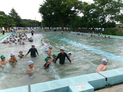 6年生のサポートを受けて、初めて入水するときは不安そうな表情が見られましたが、手を引かれてプールの中をぐるぐる歩き回っているうちに、逆に6年生を引っ張る1年生も! 流れるプールに歓声を上げていました。(泣いちゃう子もいるかな~と心配でしたが・・・)