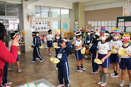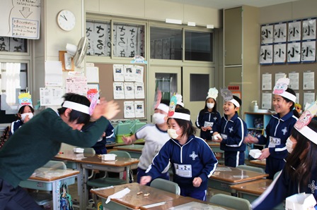 各教室で鬼のお面をかぶり、豆をまいたり楽しいゲームを行ったりしました。