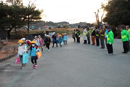 登校時には、PTA役員の方々や地域の方々、教職員が子どもたちを見守る
