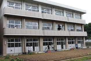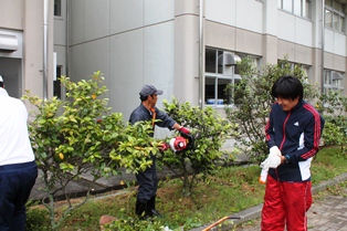 たくさんの保護者の方と教職員で、窓拭き、トイレ掃除、学校周辺の除草、木の選定等を行いました。