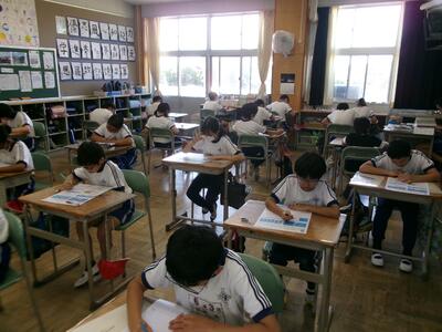 5年1組は書写。書写は字をていねいに書くだけではなく、気持ちを落ち着かせる大事な学習です。