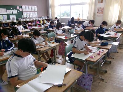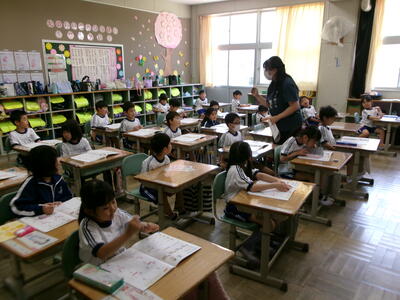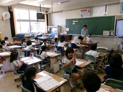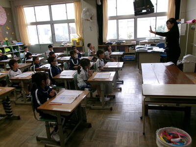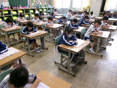 1年2組では、数字の書き方の練習です。先生の指、右と左合わせていくつ?・・・「5」次は・・・「5」