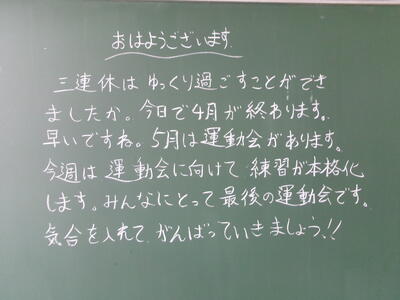 担任から子どもたちへの朝のメッセージです。何気ない一言で子どもたちが安心して楽しく学校生活を送ることができれば嬉しいです。