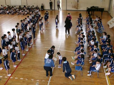 児童会主催の「1年生を迎える会」がありました。6年生と一緒の入場です。ちょっと緊張してるかな?