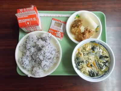 本日の給食は、ゆかりごはん、からあげ、たまごスープ、なし、ミルメーク(コーヒー味)でした。