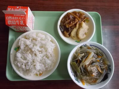 本日の給食は、むぎごはん、たこナゲット、マーボーなす、はるさめスープ、牛乳でした。