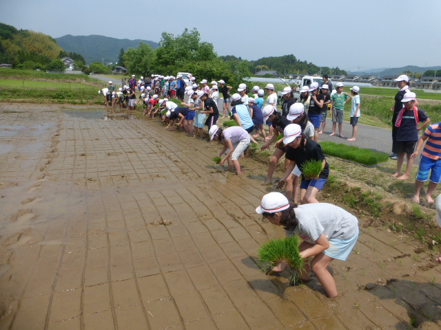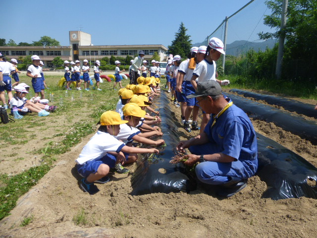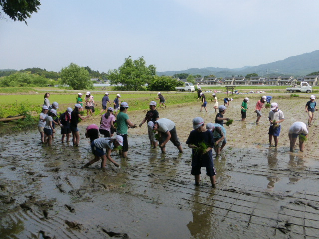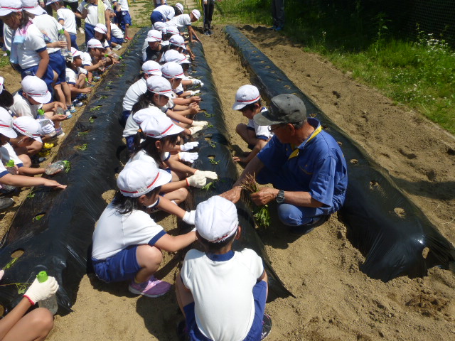 2017年5月30日 15時28分29日(月)に1~3年生がサツマイモの苗を植えました。子どもたちは「大きくなあれ」と一本ずつ心をこめて苗を植えました。収穫は9月頃の予定です。今日(30日)は、学習田で4~6年生が田植えをしました。昨年に引き続き、もち米の苗を植えました。ご指導をいただいた平塚さんから、子どもたちは植え方をほめられていました。秋の収穫まで生育が楽しみですね。