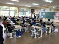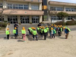 1年生は今日は早めの下校です。歩く時の注意を聞いて、途中まで先生と一緒に帰りました。