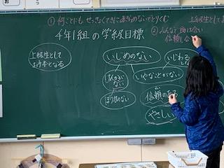 続いて4年生へ行ってみると、先生と一緒に学級の目標を考えていました。