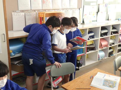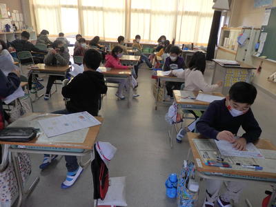 書いた文を持ち寄って相談しています。3年生は教え合いがじょうずになってきました。さて、どんなお話ができるのでしょうか。