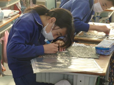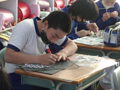 カッターナイフを使って、細かい作業をしています。教室がしーんとしています。