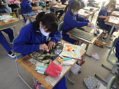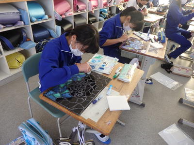 色づけをしています。そうです。ステンシル版画作りに取り組んでいるのですね。