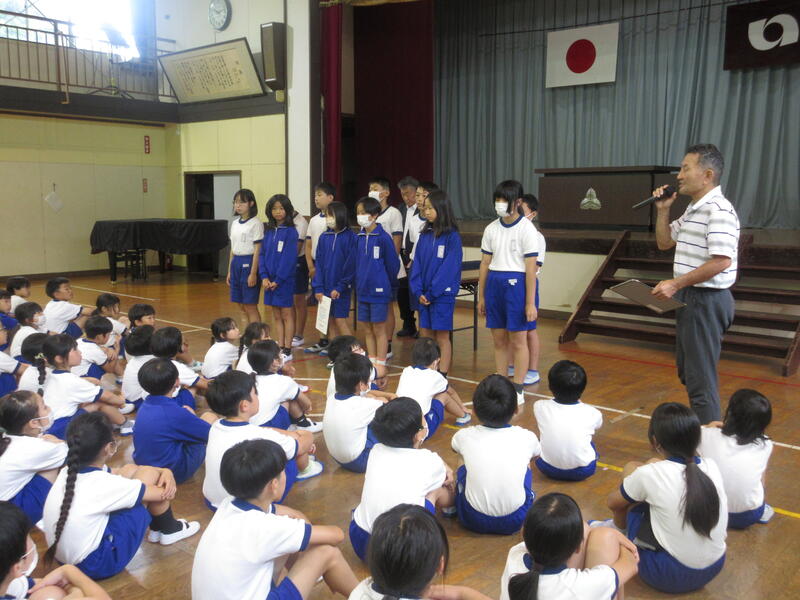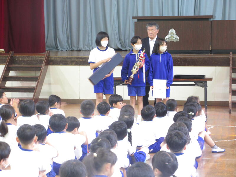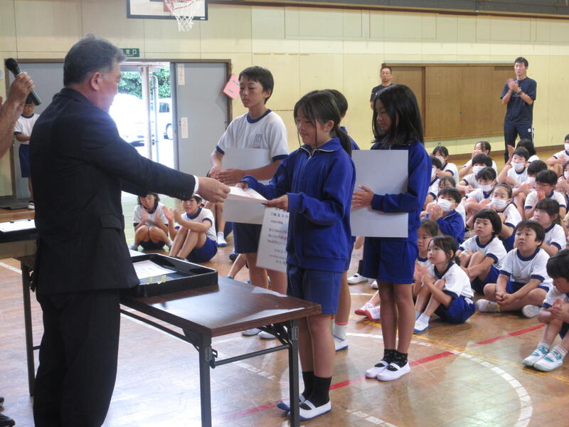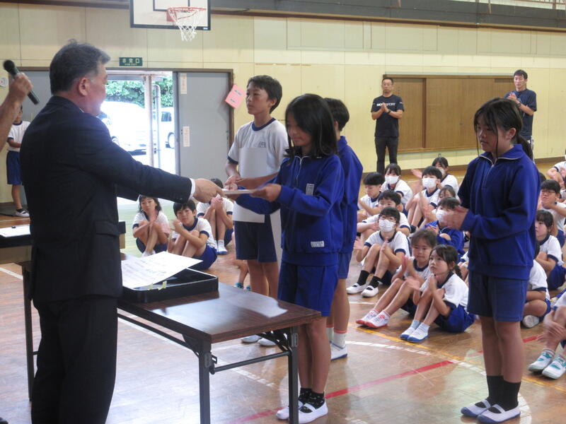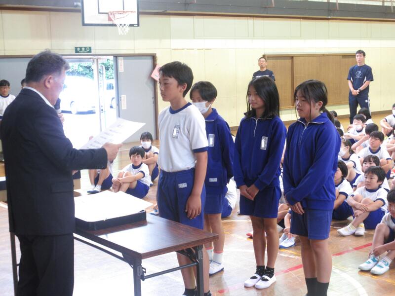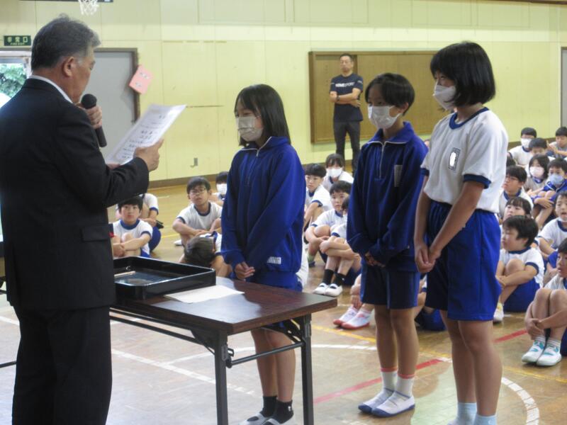 はじめに、小玉小の代表としてリレーを走ったメンバーに、記録賞が渡されました。