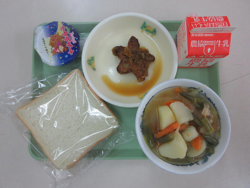 食パン 牛乳 星形ハンバーグ・バーベキューソースかけ じゃがいものベーコン煮 たなばたゼリー