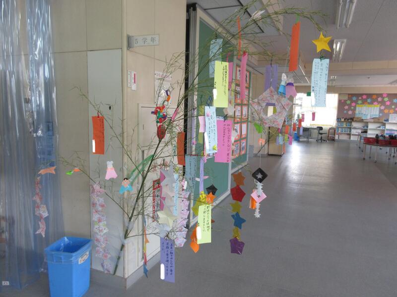 オープンスペースに学級ごとに七夕飾りがしてあります。