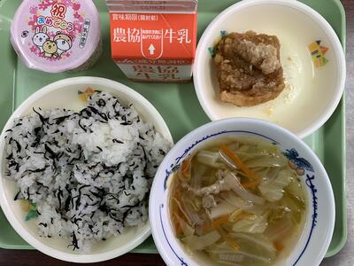 6年生にとっては、小学校で最後の給食です。卒業お祝いゼリーも付いて、うれしいメニューです。615kcalです。いただきます。