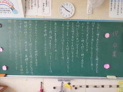みなさんこんにちは。児童のみなさんは、今日も笑顔で過ごしているところだと思います。さて、今日で令和3年度は終了です。今年度も児童のみなさんは心も体も大きく成長しました。これは、保護者のみなさま、地域のみなさまのご支援があったからこそ叶ったことです。です。本当にありがとうございました。