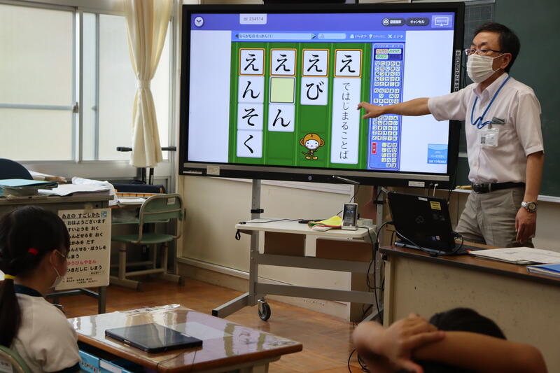 今回は1年生に、タブレットでの文字の入力などを教えていただきました。