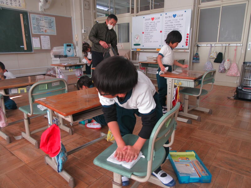 1年生は道徳科で、「お世話になった教室に感謝の気持ちを伝えよう!」と自分の使っている机や椅子をぴかぴかにみがいていました。