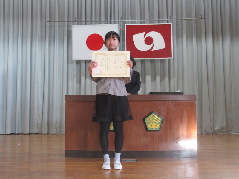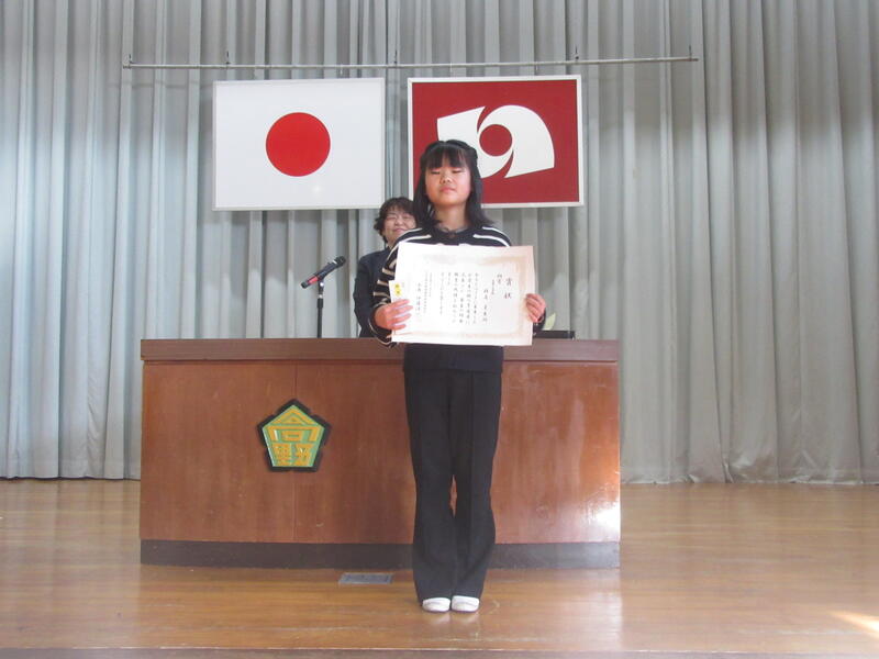 最後に、賞状の伝達が行われました。JA書道・ポスターコンクール。ユニバーサルデザイン写真やさしさコンクール。税の書道コンクール。木工工作コンクールで優秀な成績を修めた児童に賞状が送られました。
