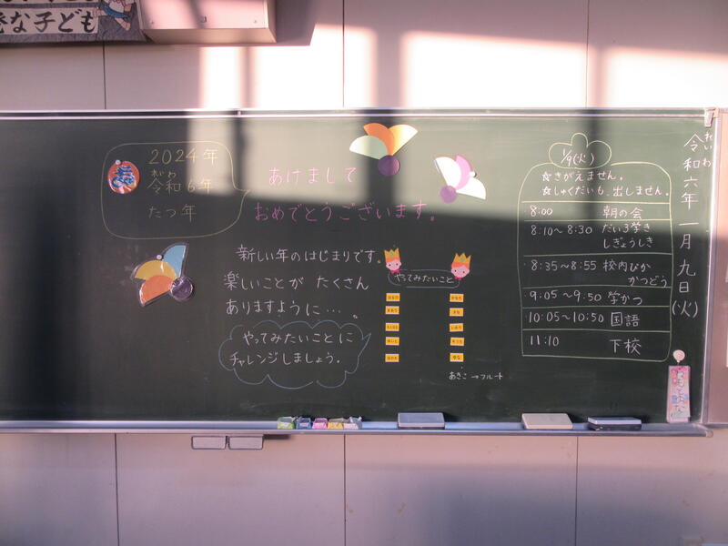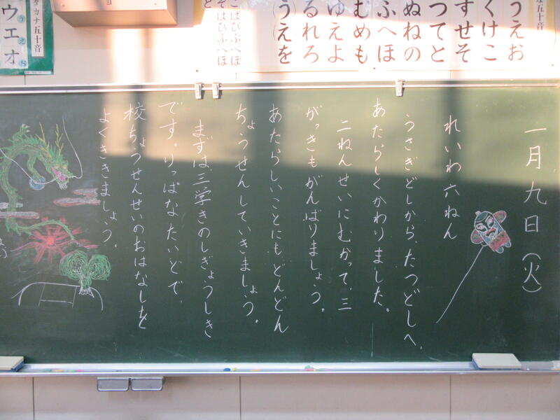 校長先生は、「3学期はまとめの学期です。また、次の学年の準備をする大切な学期です。」とお話しになりました。準備をして次の学年にいくのと、準備をしないでいくのでは大きな違いがあるようです。「何を頑張るのかひとりひとり目標を立てるといいですね。今年は辰年です。みんなでぐんぐん昇っていけるような年にしましょう!」新年のお話を受けて各教室では、今年の目標を立てていました。