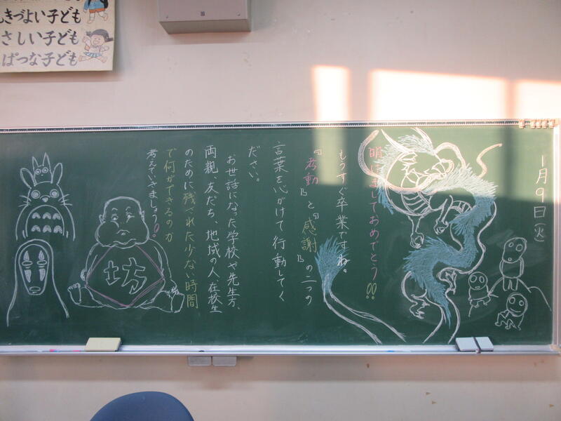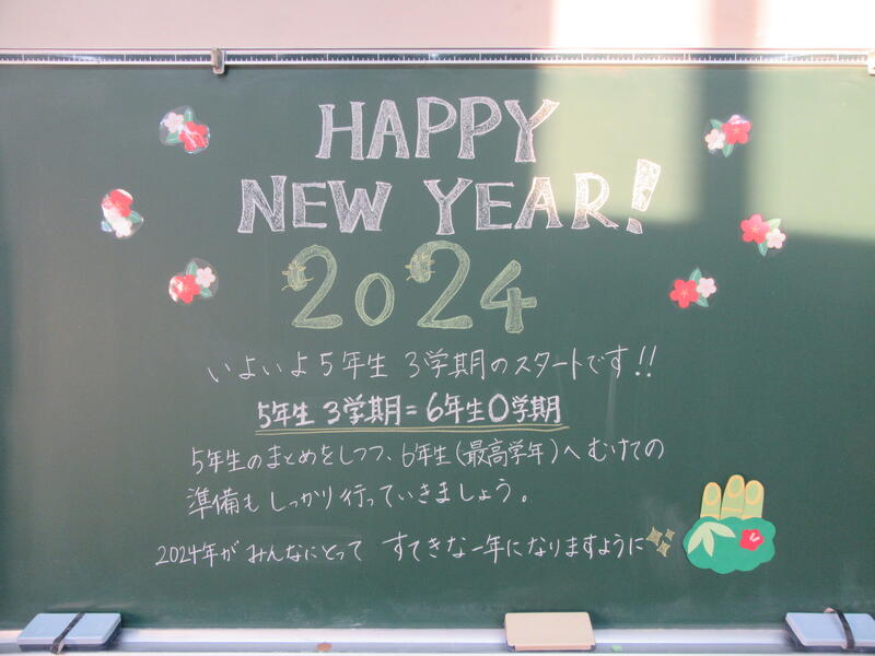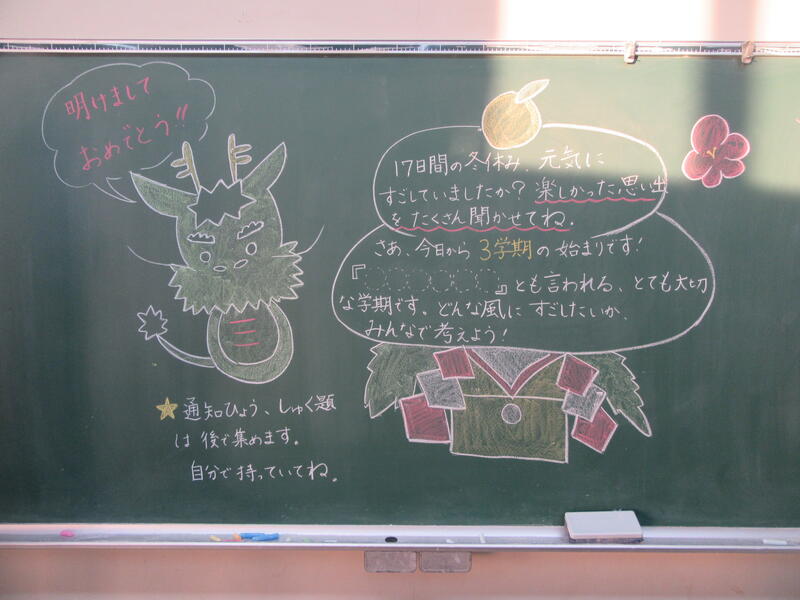 各教室には黒板年賀状が準備されていました。担任の先生のメッセージはうれしいですよね。子供達も何度も見返していました。