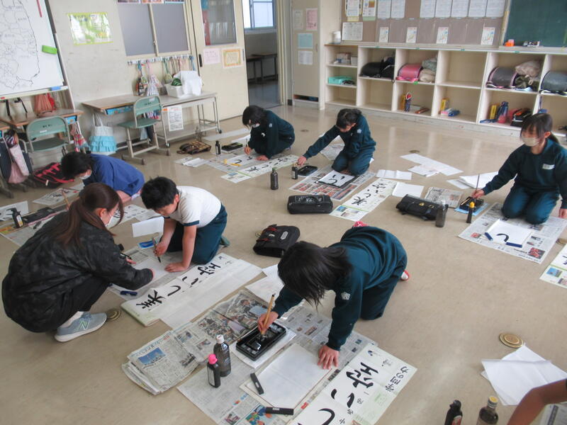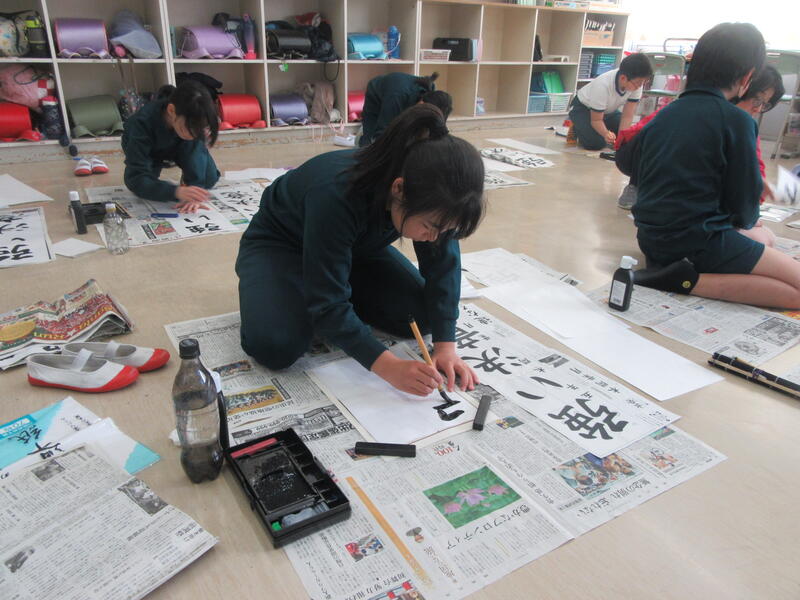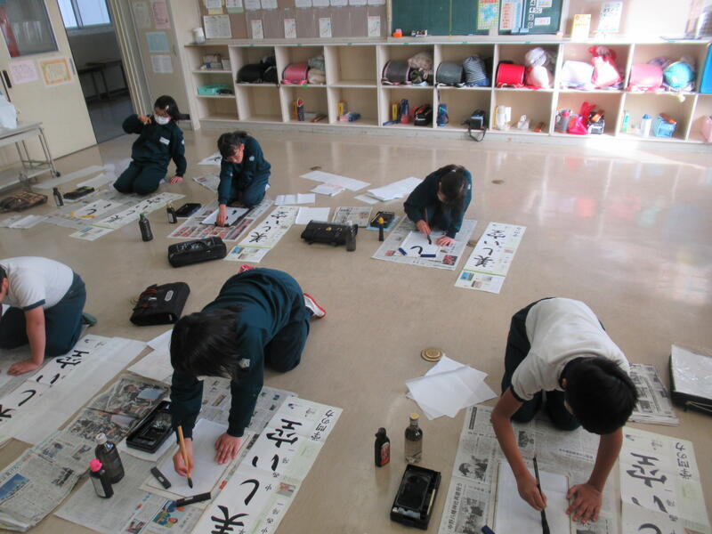 3年生は「明るい心」という文字を書いていました。初めて長い用紙に書くのは大変でしたが、のびのびとした力強い字を書いていました。