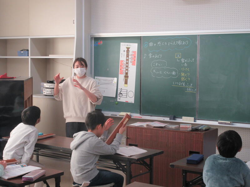 3年生は音楽科で、曲の感じをとらえて歌っていました。「雪のおどり」という曲を聴き、輪唱や音の重なりを楽しんでいました。