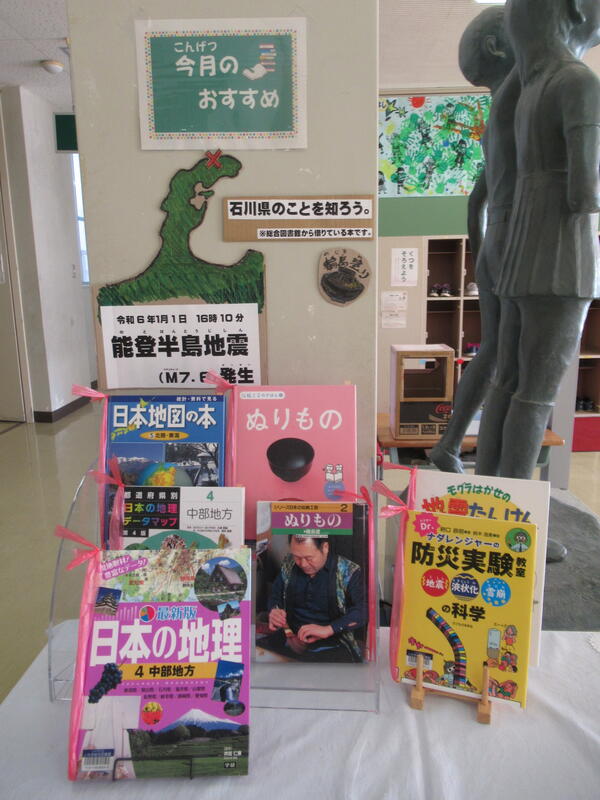 図書室と玄関前には、図書の先生が読書に親しむために図書コーナーを設置してくださっています。1月は辰年にちなんで竜が出てくる本が図書室に展示されています。昇降口には能登半島地震で災害に見舞われた石川県に関する本が展示されました。