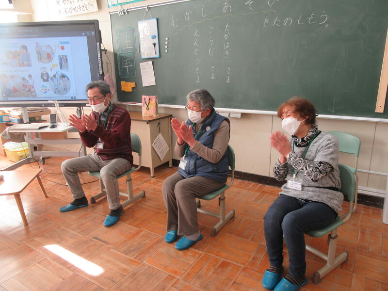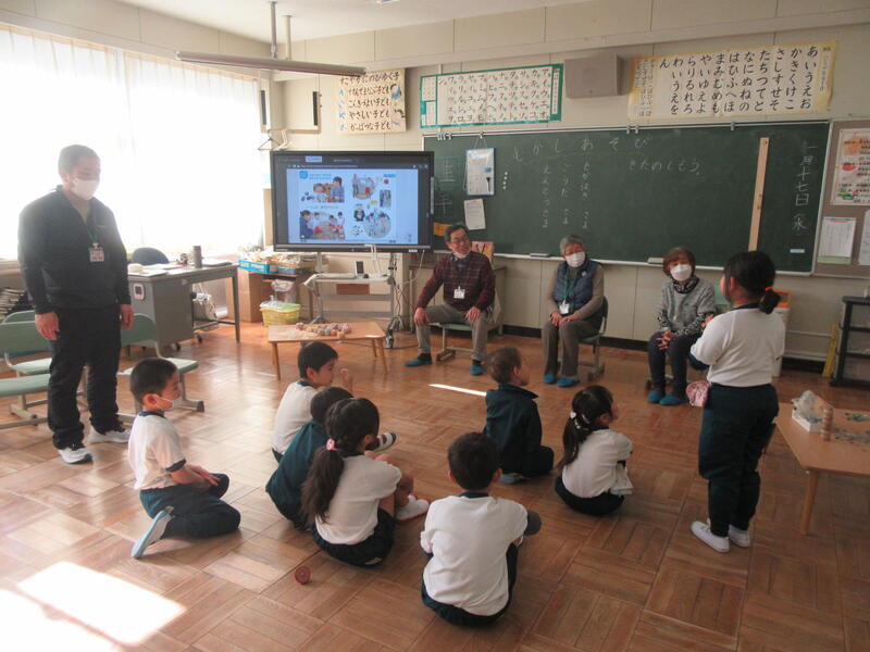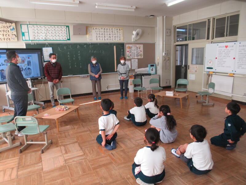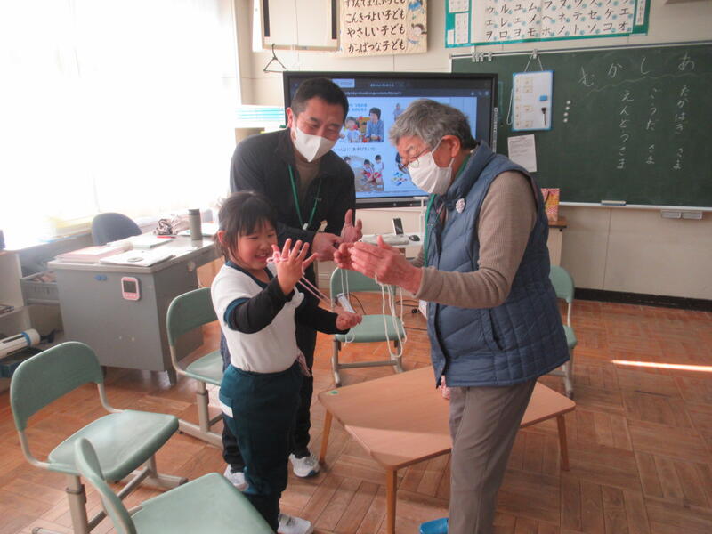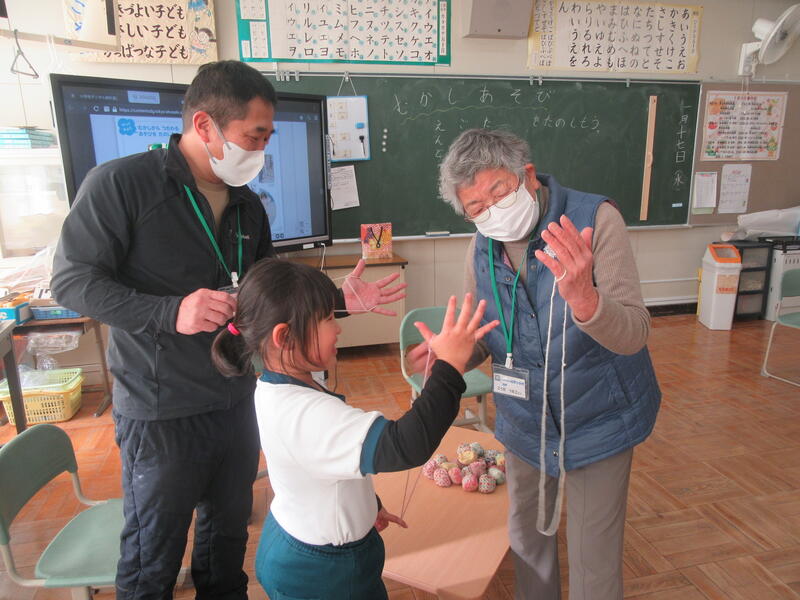 1月17日(水)3校時に1年生教室で昔遊びが行われました。1年生の生活科では、「ふゆをたのしもう」ということで、正月遊びや昔遊びを体験してきました。とても楽しい活動なのですが、コマ回しやけん玉、あやとりなどコツがいるあそびもあります。本日は高野町から郷田ウタ子さん、髙萩民雄さん、遠藤幸子さんにおいでいただきました。