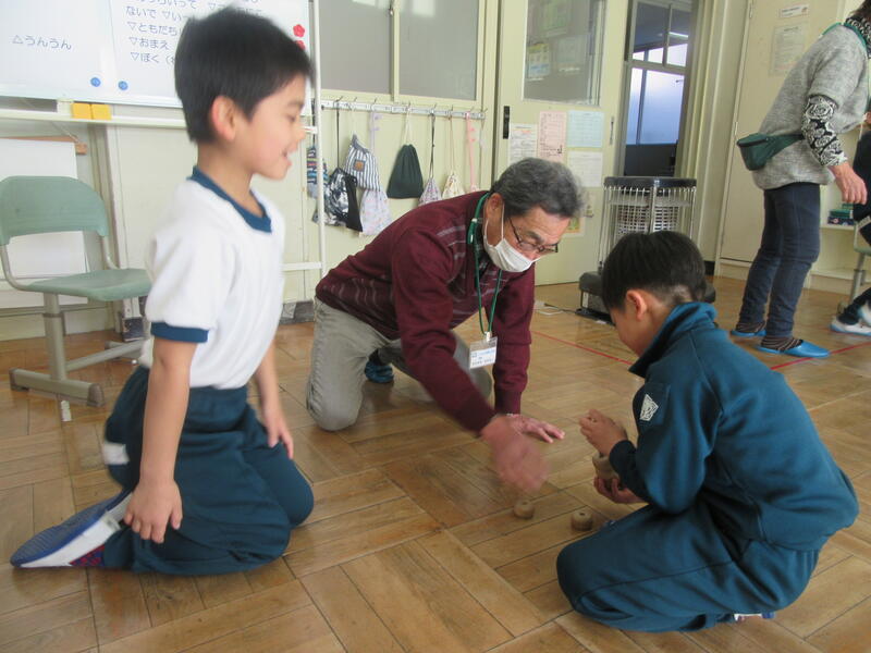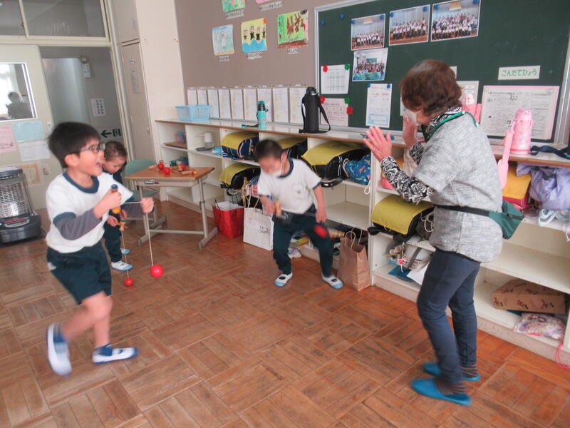今回はけん玉、おはじき、ビー玉、あやとり、こま回し、だるまおとし、お手玉のコーナーを作りました。地域の方々がコツを教えてくれましたよ!