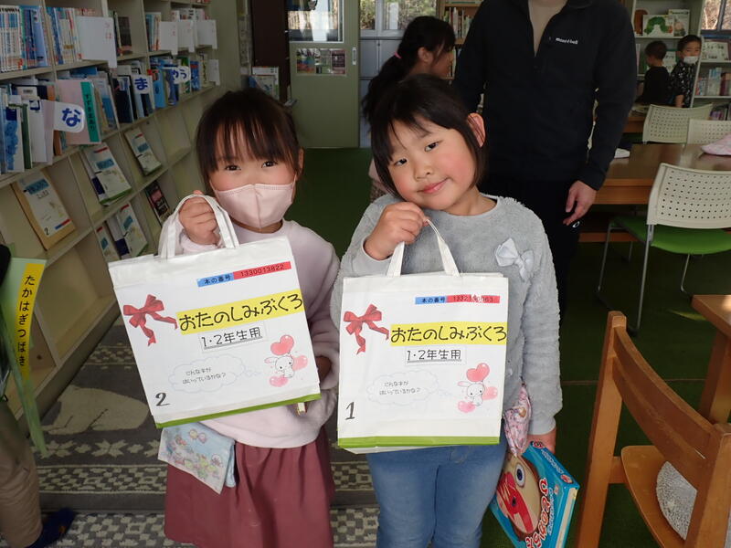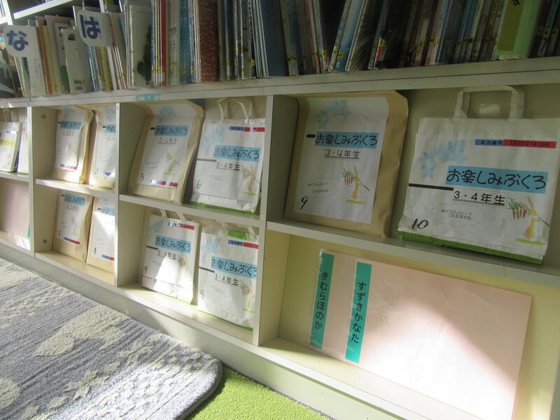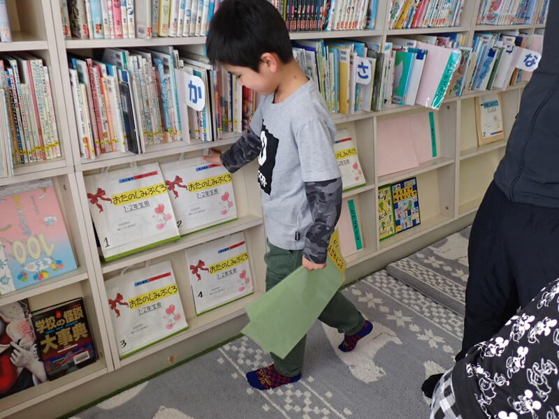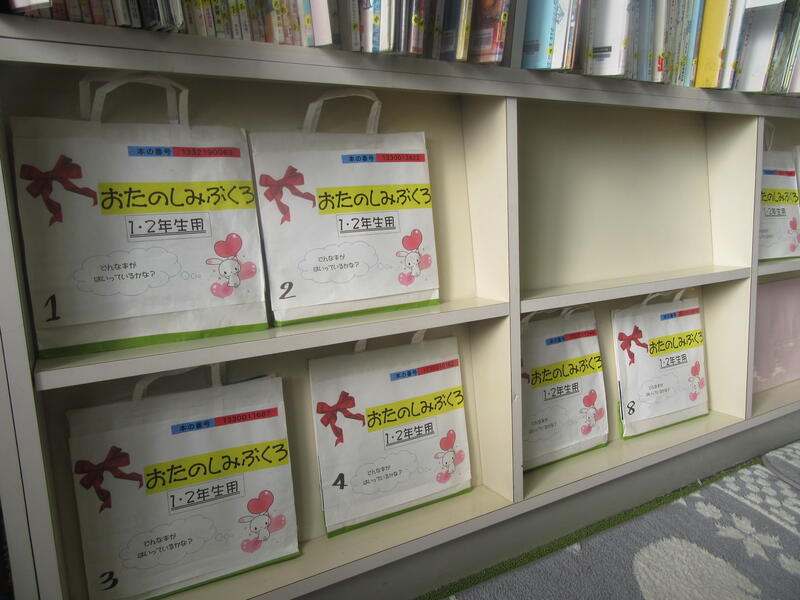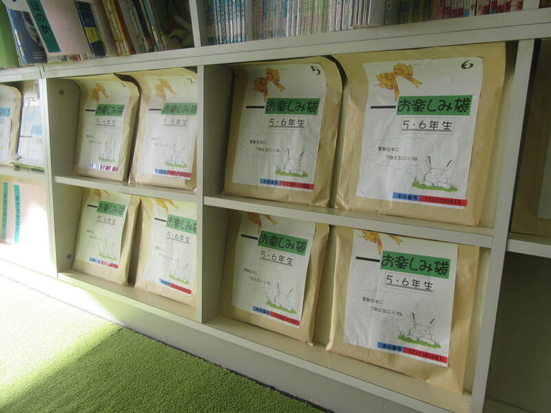このふくろは高野小の図書委員会で企画した「お楽しみぶくろ」です。図書委員会の皆さんが話し合って、各学年の高野っ子に読んでもらいたい本を選び、ふくろに詰めました。何が入っているかは、借りてからのお楽しみだそうです。ふくろを手に取り、どんな本が入っているのだろうとわくわくしながら、1年生は本を借りていました。