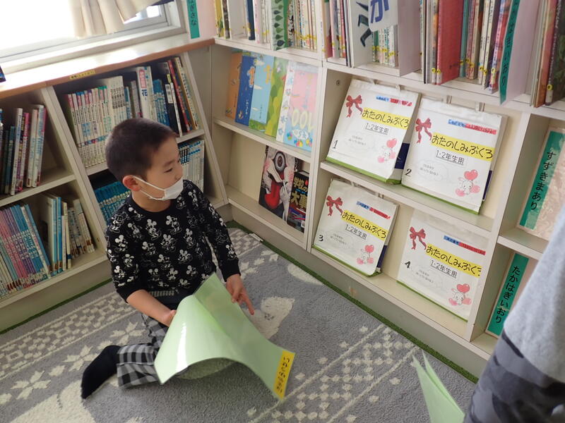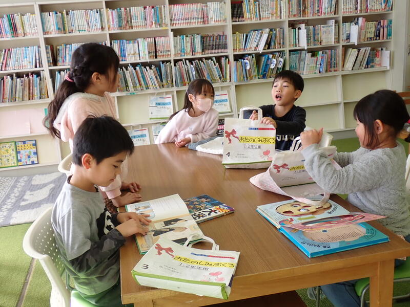 1月17日(水)図書室にとある袋が出現しました。1年生は不思議そうにその袋を眺めています。