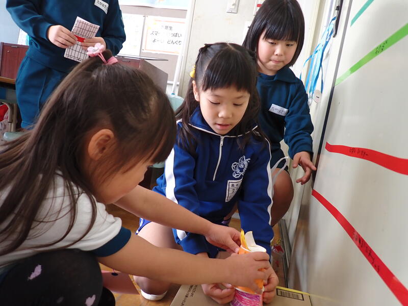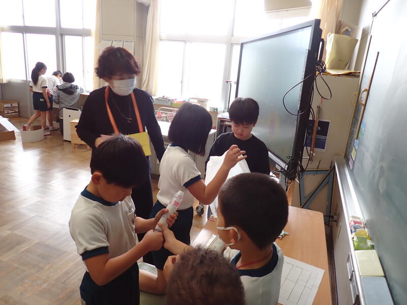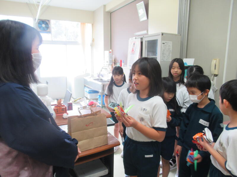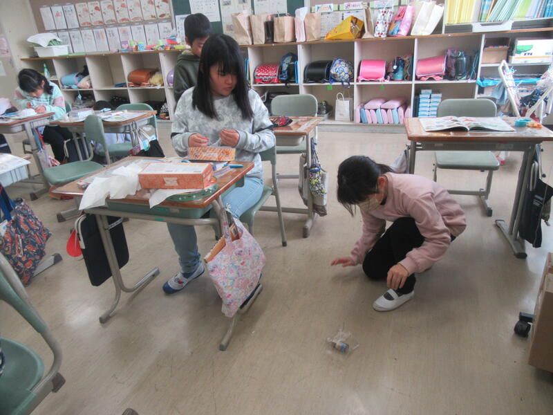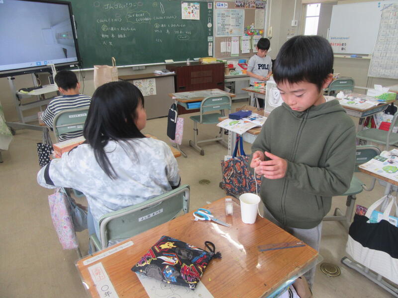 3年生は図画工作科で、「ゴムゴムパワー!」というゴムがねじれてもどる仕組みを利用したおもちゃを作製していました。理科の学習でも、ゴムの力について学びましたね。どんな仕組みか聞いて見ると、順序よく説明してくれる子もいました。