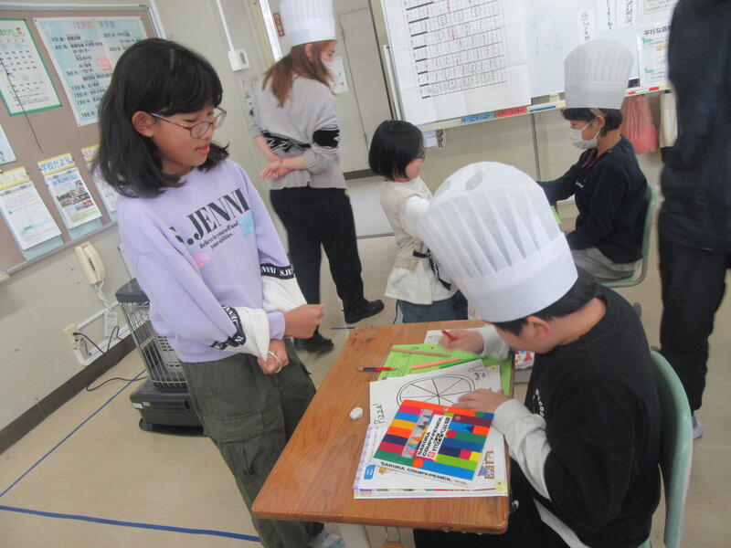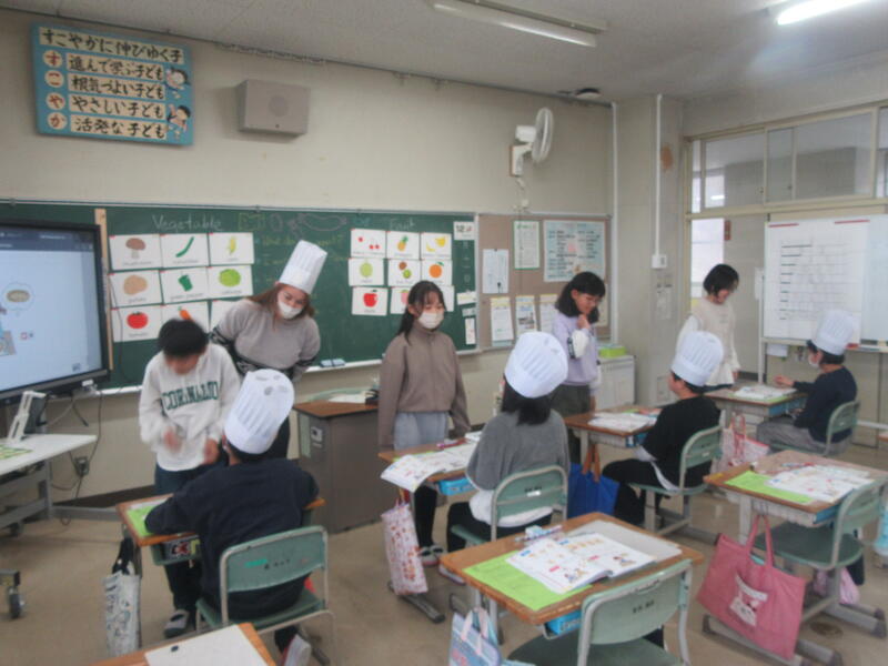 4年生の外国語活動では、「What do you want ~ ?」の表現を使って学習していました。ピッツアシェフ役の友達が、英語で質問します。自分好みのピッツアを作ってもらいたいので、欲しいトッピングをシェフに伝えていました。美味しそうなピッツアができあがりました!